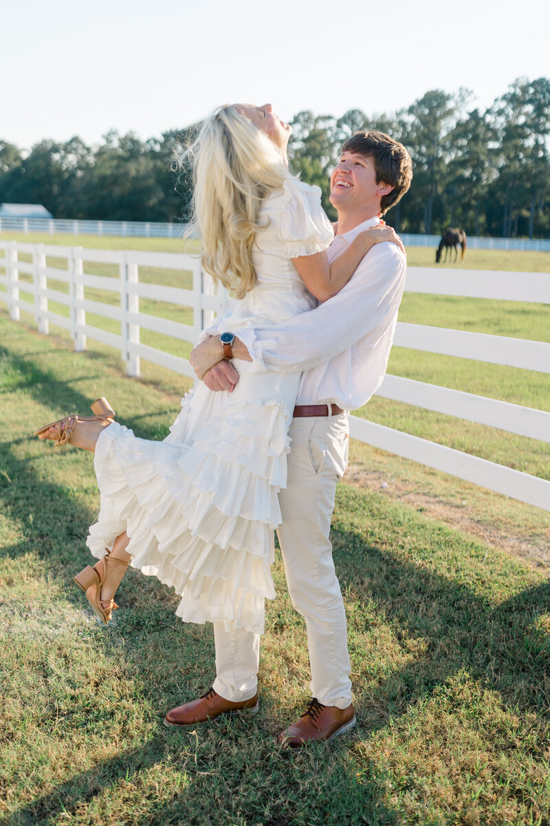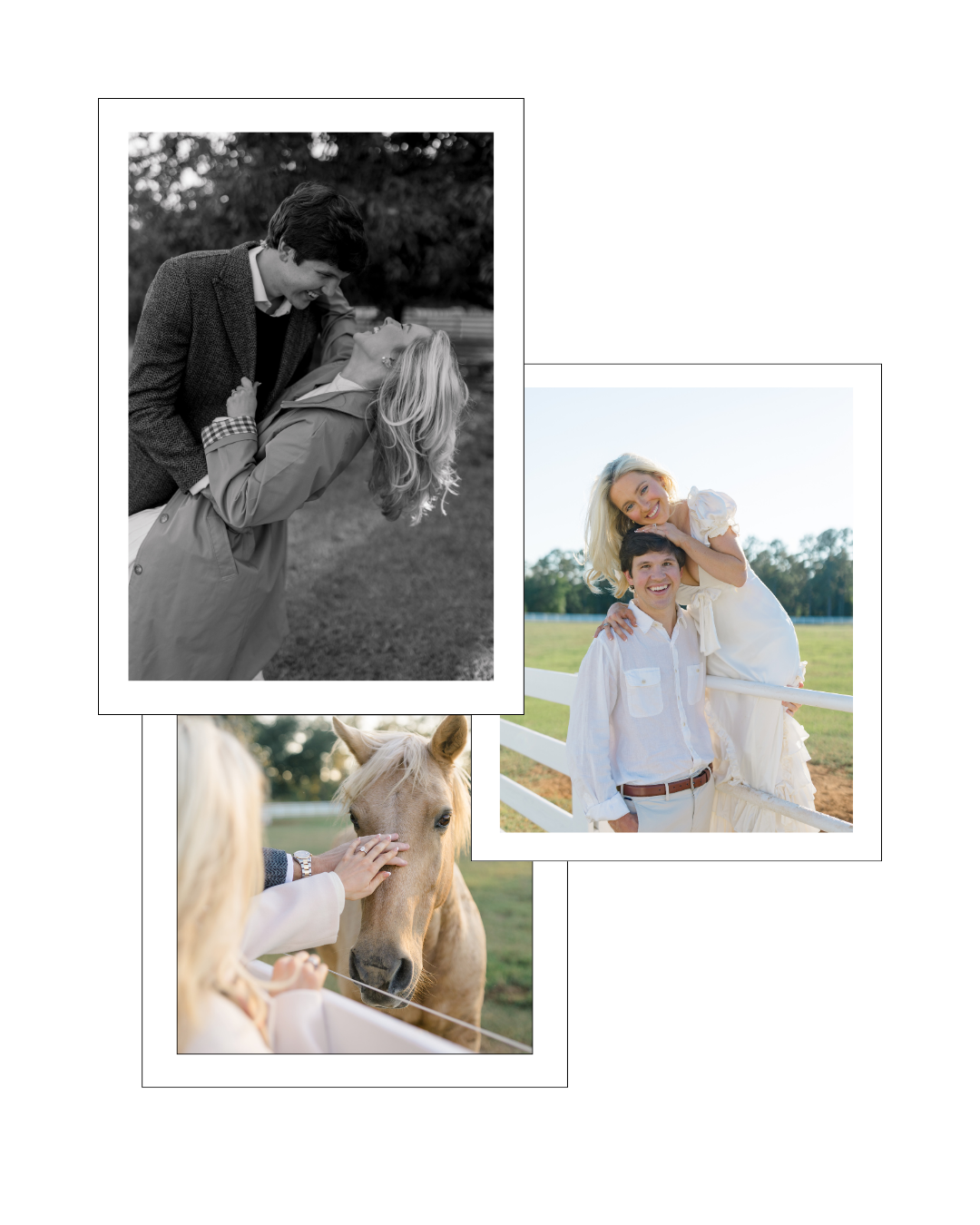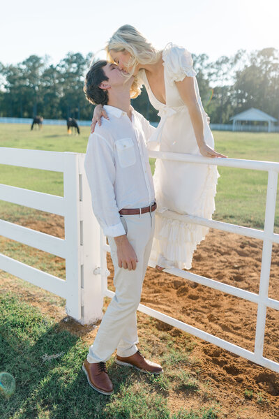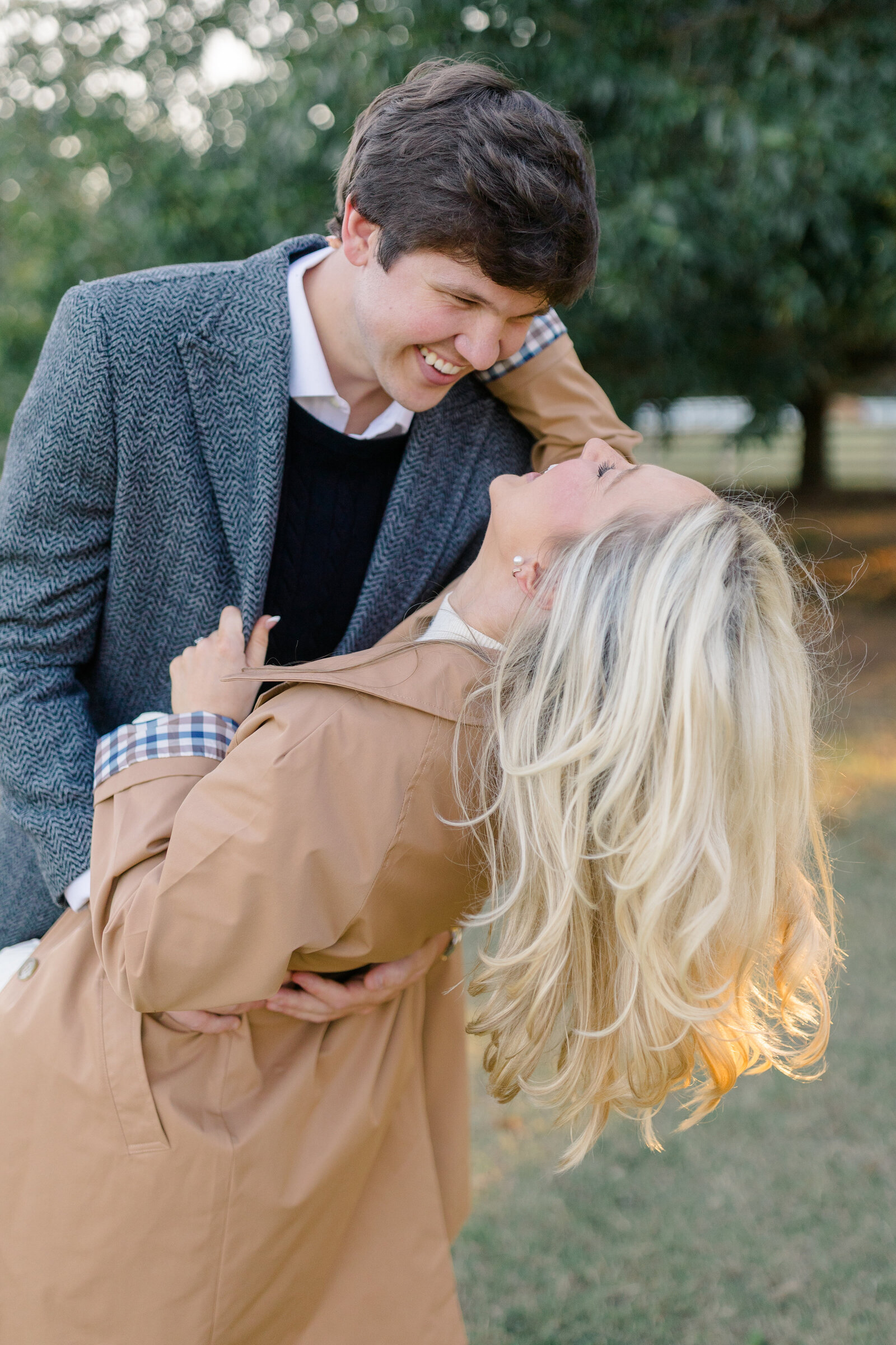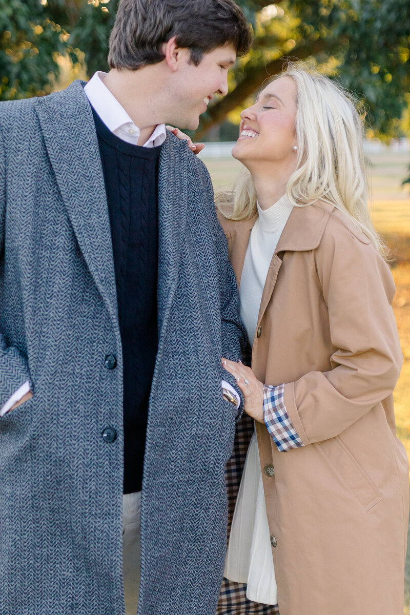 Set on the Georgia countryside, their engagement session unfolded among white fence-lines, open fields, and grazing horses, each detail echoing southern charm. Despite the warm 80-degree day, the couple embraced the moment in layered trench coats, capturing that perfect blend of polish and authenticity.